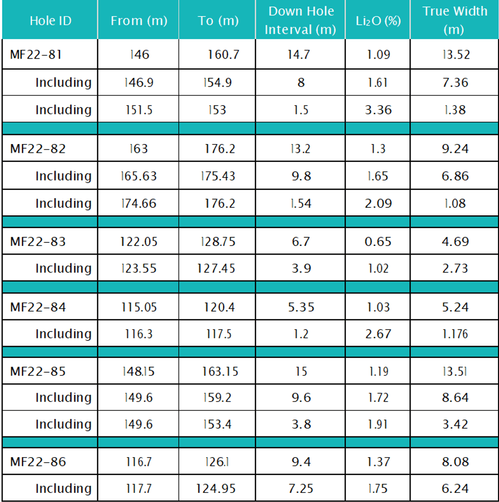 - Hole MF22-81 assay highlights of 14.7m @ 1.09% Li2O, from 146m including: