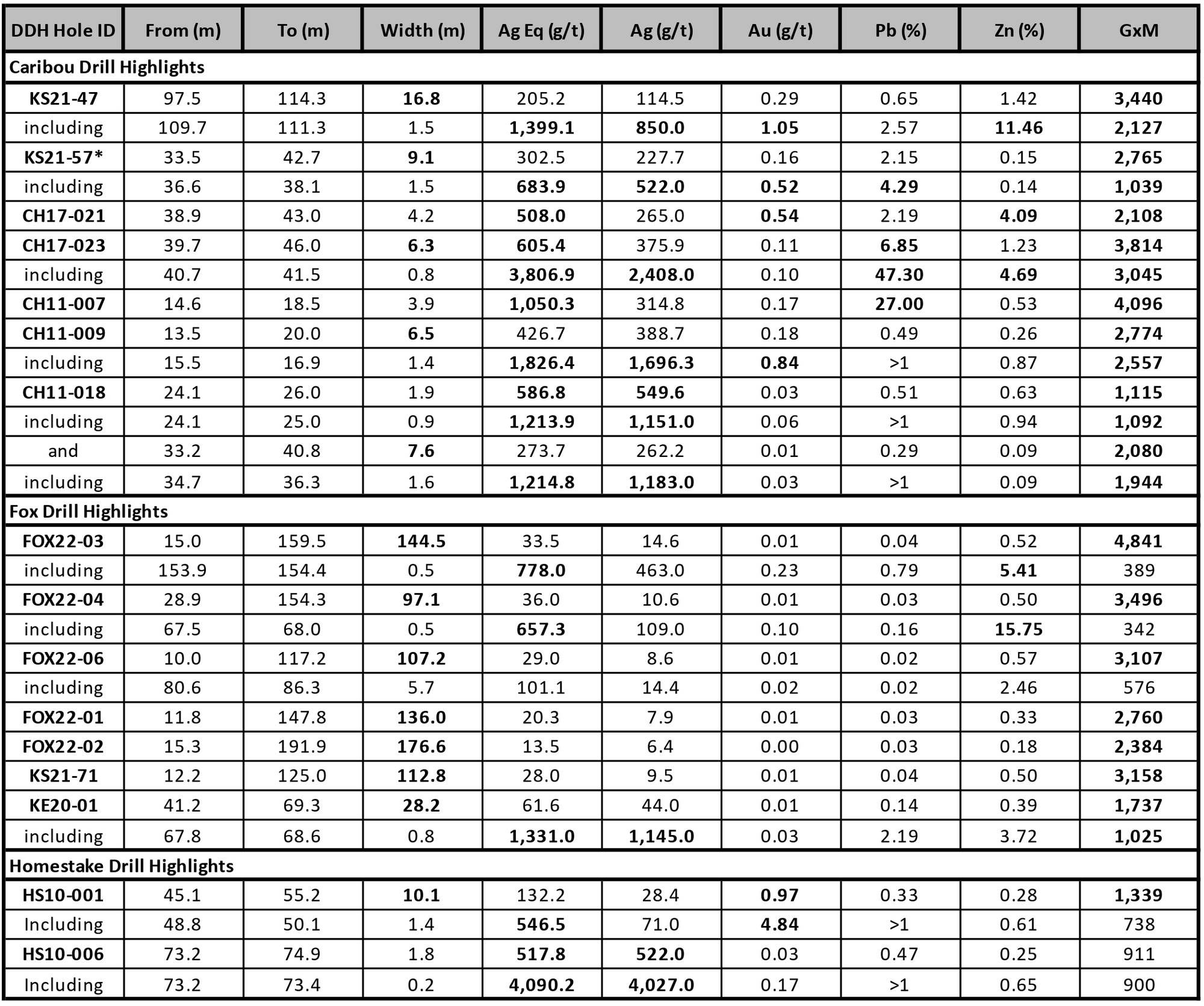 Table 1 - Summary of Significant Keno Silver Project Drill Results (Caribou, Fox, Homestake Target Areas)