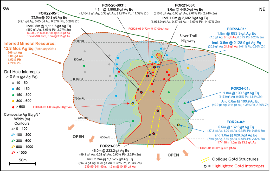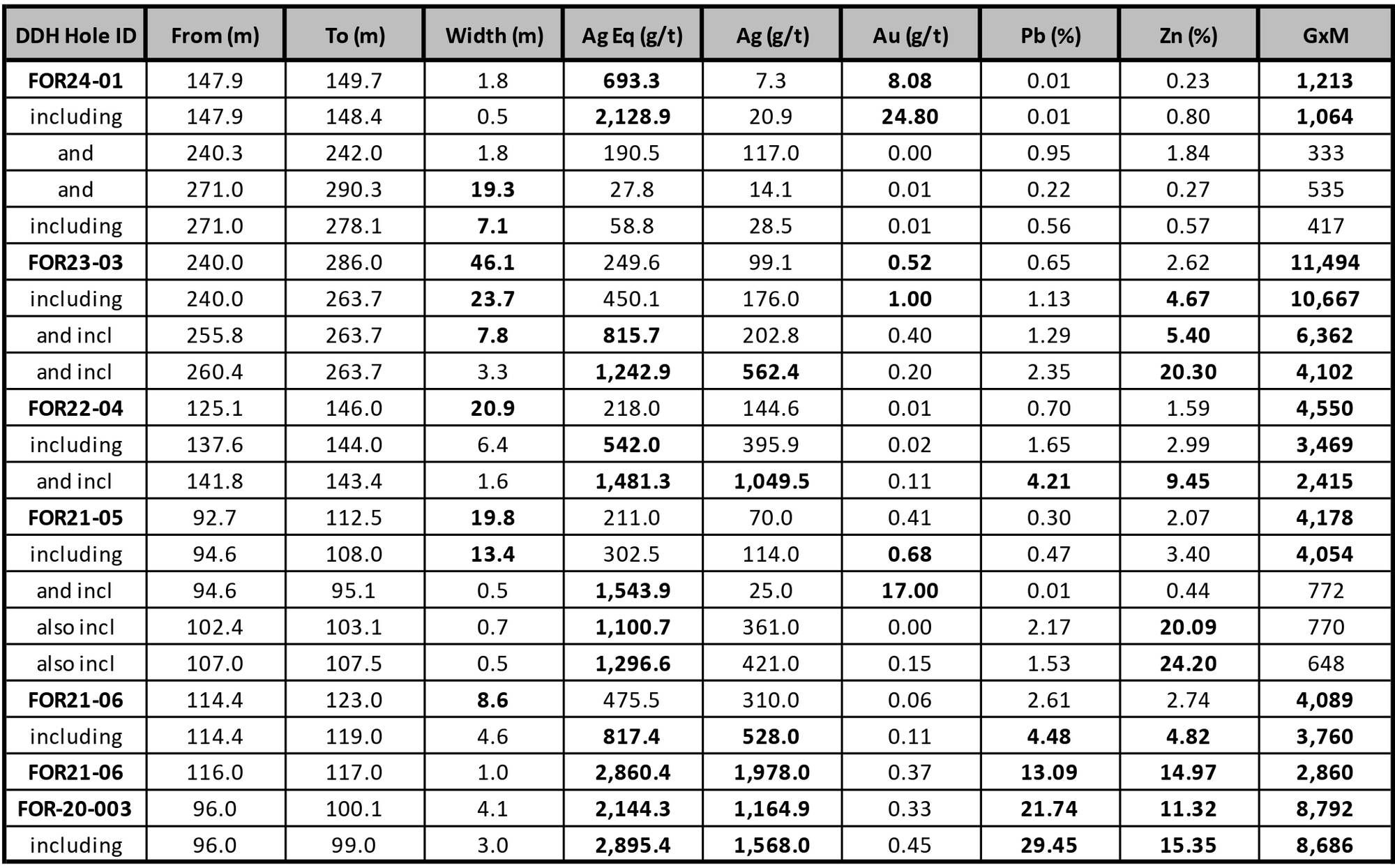 Impressive past drill results: FOR23-03 returned 46.1 m grading 249.6 g/t Ag Eq (99.1 g/t Ag, 0.52 g/t Au, 0.65% Pb, and 2.62% Zn), for a grade thickness of 11,494 gram-meter ("GxM"), with multiple internal higher-grade zones including 3.3 m of 1,413 g/t Ag Eq (562.4 g/t Ag, 0.20 g/t Au, 2.35% Pb and 20.3% Zn) (see Table 1).