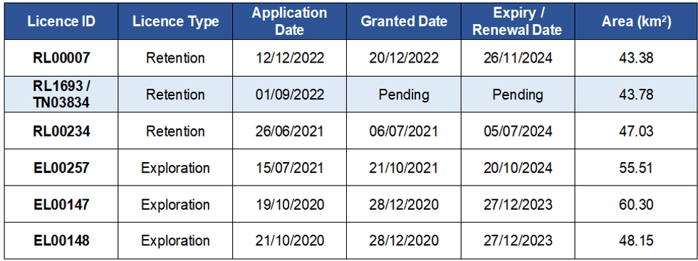 - Mining Licence Application (MLA) TN03834 covers Retention Licence (RL) 1693, the focus of the Stage 1 Feasibility Study announced March 2023; and