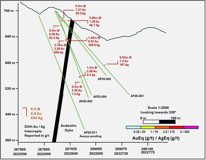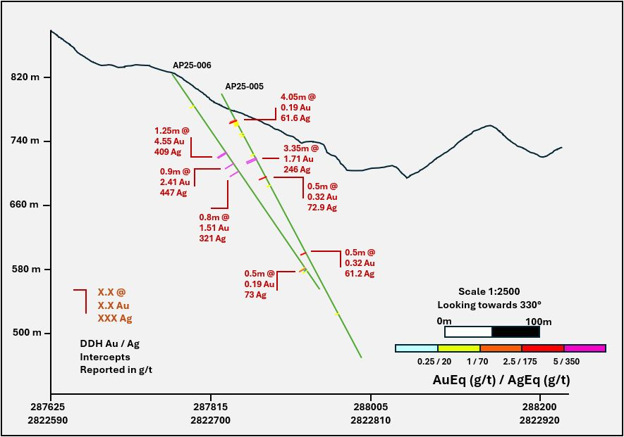 3.35 m @ 366 g/t AgEq ( 1.71 g/t gold, 246 g/t silver) from 90.15 m (AP25-005), including