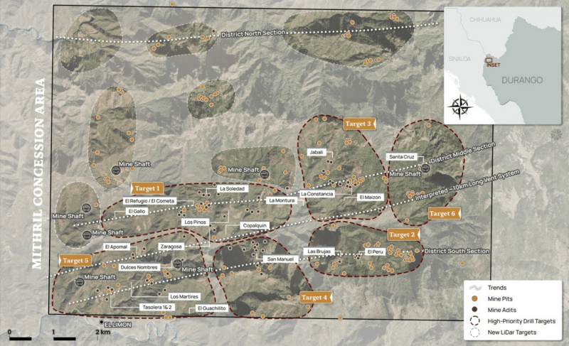 Mithril is undertaking an aggressive exploration program in 2026, with up to 25,000 metres of drilling planned during the first 6 - 8 months of the year across the Copalquin District. Upcoming work will focus on expanding known mineralized zones, testing new high-priority targets, integrating district-wide geophysical data, and continuing to advance the Company's district-scale exploration thesis. The district features over 100 historic underground workings (c.1850 – 1910) including several multi-level mines and 200 small surface workings. Mapping and sampling across the lower half of the 70 km2 mining concession area demonstrates and a large epithermal silver-gold system with multiple target areas for potential resource growth plus the conduit system responsible for the widespread silver and gold mineralisation.