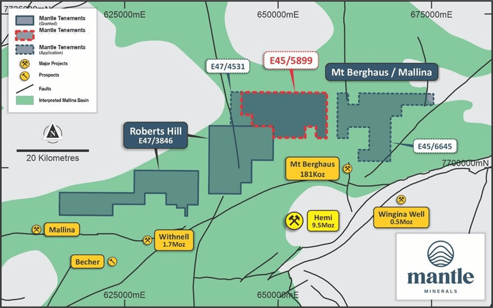 Mantle Minerals Limited (ASX:MTL) (“the Company”) is pleased to announce the grant of Mt Berghaus exploration licence E45/5899, which covers approx. 84km2 immediately north of De Grey Mining’s Hemi discovery. See tenement outlined in red, Figure 1. This brings the Company’s granted tenements in the area to a total of approx. 399km2.