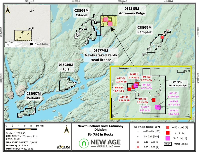 February 27, 2026 TheNewswire - Rockport, Ontario– New Age Metals Inc. (TSX.V: NAM | OTCQB: NMTLF | FSE: P7J) ("NAM" or the "Company") is pleased to report results from its Phase 2 follow-up exploration program at the Company's St. Alban's antimony–gold properties in southern Newfoundland and Labrador.