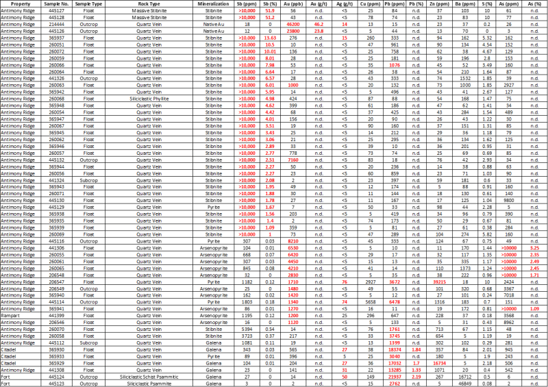 Cautionary Note: Grab rock (outcrop and boulder) samples are selective by nature and are unlikely to represent average grades on the Property. These results are preliminary in nature and not conclusive evidence of the likelihood of the occurrence of a mineral deposit. However, these samples demonstrate significant antimony and gold (and copper, zinc, silver and lead) mineralization potential on portions of the St. Alban's area properties.