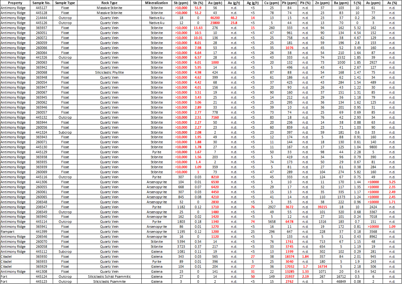 The southeastern portion of the property hosts the highest-grade antimony values identified to date, including over-limit samples grading:
