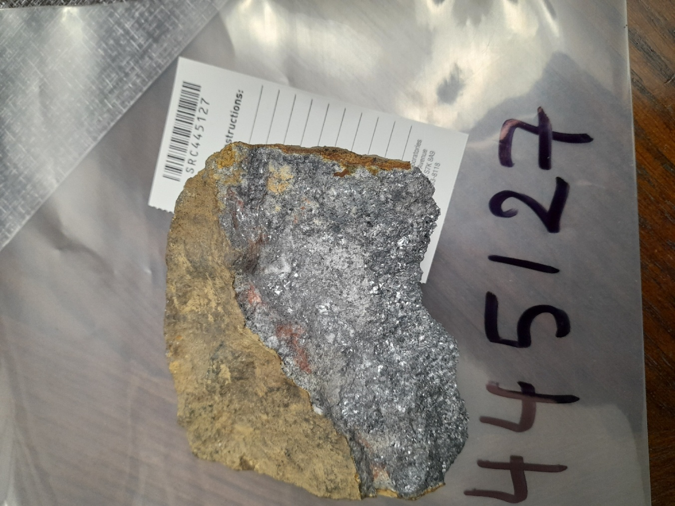 Figure 1: High-grade angular stibnite float sample 445127 from the Antimony Ridge property that graded 51.9% Sb