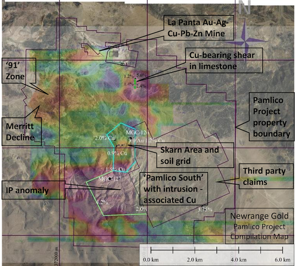 Pamlico South: In this new area, south of the Skarn Zone and extending along the southern part of the property, several intrusive bodies have been recognized and are being mapped out in more detail. Â Grab samples from shears, veins and contact zones within the intrusive rocks returned up to 3.75% copper with associated endoskarn alteration (see Fig. 2 ), while copper mineralization up to 4.2% in grab samples along with widespread anomalous copper, zinc and lead in soils is associated with exoskarn alteration within the adjacent sedimentary rocks.* Â This extensive area is underlain by a strong chargeability (IP) anomaly roughly 3 kilometres across.