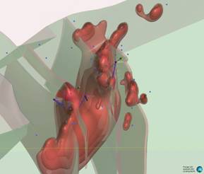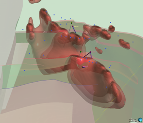 Figure 2: Series of oblique three-dimensional views of modelled of modelled Wishbone VMS Target showing location of Panther diamond drillholes (based on magnetic inversion model shells). Notes: Image highlights the size of the modelled magnetic body at depth. Blue dots signify permitted drill pads. For relative scale and description of other features please see the notes below Figure 1. |