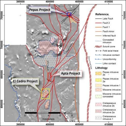 The El Cedro prospect lies to the south of the same integrated licence that hosts both Pepas and APTA and is roughly 4km south of the APTA base camp.