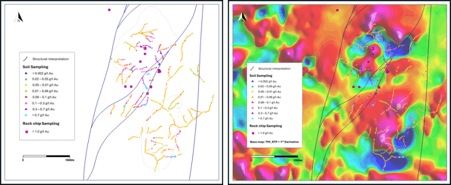 Assay results from this new program demonstrate this southern intrusive system to be largely similar to the northern body, demonstrating high grade gold in soils, at times over 1g/t Au, over total area of roughly 2km x 3km.