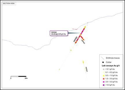 PEP082, 26.4m @ 2.85g/t Au from 5.3m.