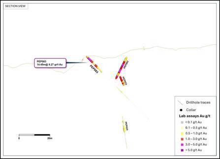 PEP083, 14.45m @ 8.27g/t Au from surface.
