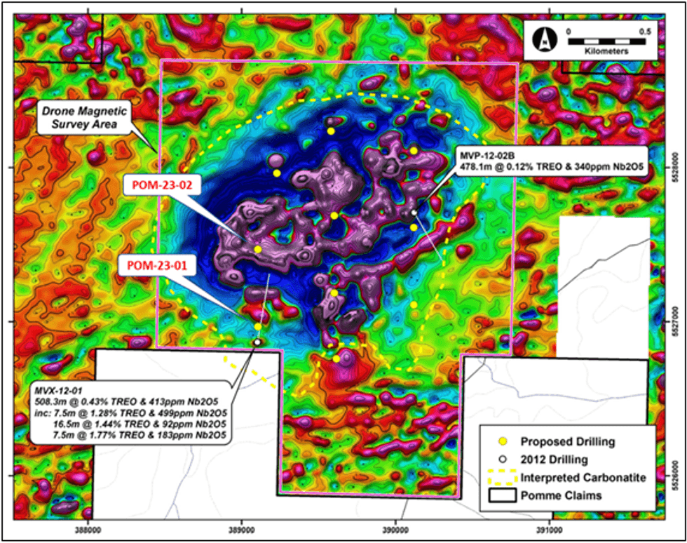 A program of diamond drilling was recently commenced at Pomme (see MTM ASX announcement dated 26 May 2023). The first drill hole of that program, POM-23-01 (Figure 2), was subsequently completed at a depth of 558 metres downhole (Appendix I). This hole was collared approximately 100 metres to the north of a historical drill hole MVX-12-01 that also intersected in excess of 500 metres of REE-Nb mineralisation.