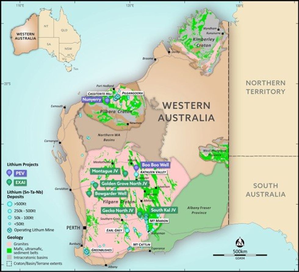 The Golden Grove North project, located in the Yalgoo greenstone belt, is an emerging lithium fertile camp which contains the advanced LCT lithium pegmatite project held by Firetail, near the Melville gold deposit. This Joint venture with Venture minerals (ASX - VMS), within the Deutche Rohstoff joint venture subsidiary EXAI,3was EXAI’s most recent project addition. Exploration fieldwork commenced in May evaluating the prospectivity of the area and will be ramping up in coming months. The project tenure is large and is known to host mapped felsic intrusives and pegmatitic rocks. EXAI plans to conduct initial systematic mapping and sampling to determine fertility and identify potential high priority areas. SensOre’s AI-generated lithium fertile granites are associated with the targets across the joint venture tenure. Reported evidence of LCT pegmatites adjacent to the project makes it a compelling area and, once the due diligence period is completed, EVAI plan to complete extensive field investigations prior to drill testing planned for 2H 2023.