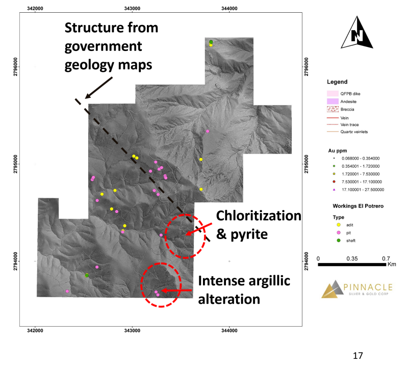 On the separate Maria Fernanda 2 (‘MF2') claim block to the southwest (Figure 3), 3 shafts, 14 adits and 22 pits are somewhat scattered across the concession.  While this area has never been explored by modern methods, government maps indicate a northwest-southeast trending structure passing through the middle of the block, parallel to the Dos de Mayo system and to the regional structural trend.  The LiDAR also indicates a number of smaller structures perpendicular to this trend.  The road from Topia passes through the middle of the block and road cuts locally display intense argillic alteration and pervasive chloritization with minor pyrite that, collectively, may be indicative of a buried hydrothermal system.  Several of the pits interpreted from the LiDAR appear to lie in close proximity to this zone. Pinnacle's geological team is planning a systematic and thorough evaluation of the area, commencing early in the New Year. Â