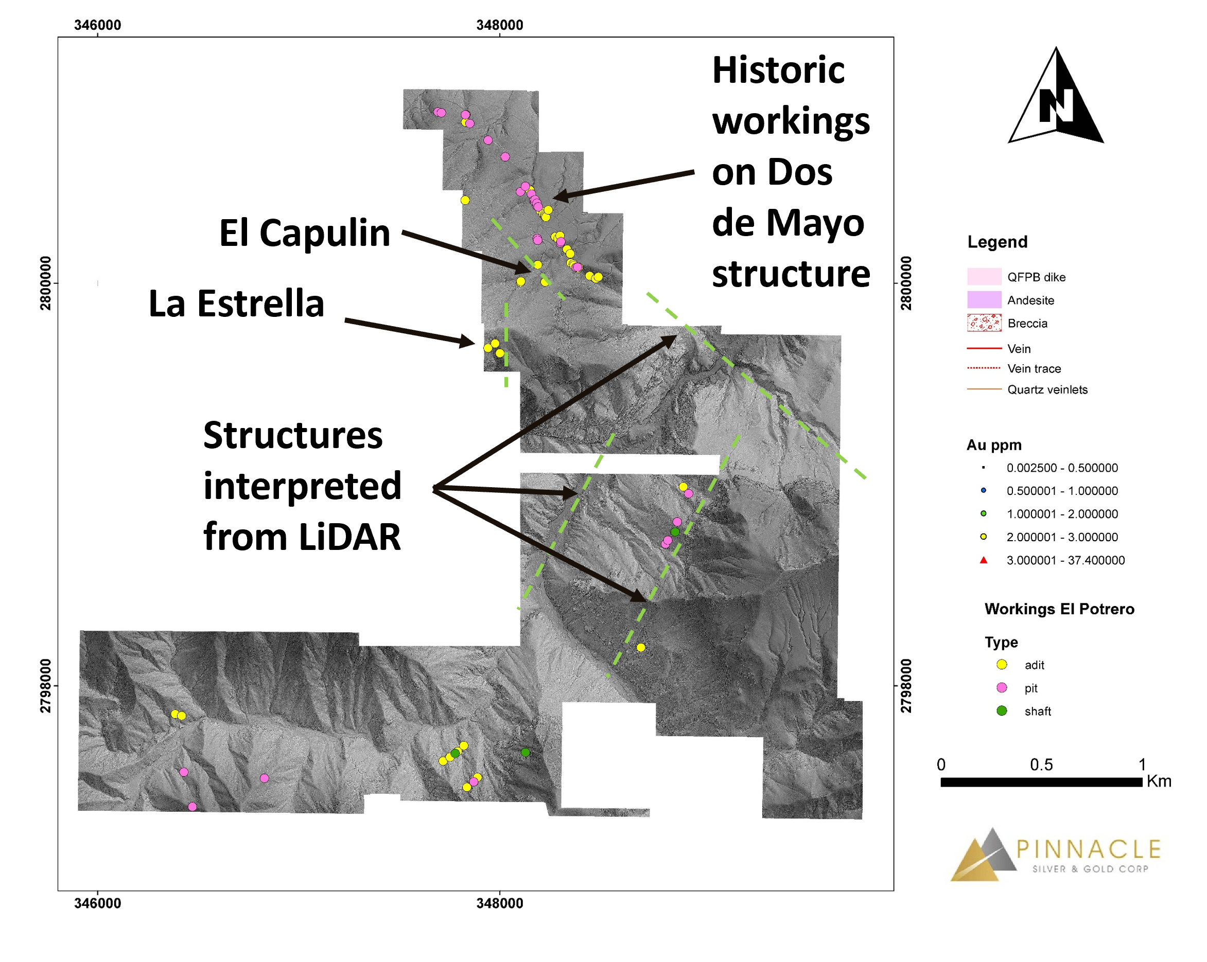 "The LiDAR survey was highly successful in confirming the 1,600 metre known strike length of the Dos de Mayo vein system and, perhaps more importantly, has identified new structures, often with artisanal workings that may indicate the presence of vein material," stated Robert Archer, Pinnacle's President & CEO. Â "The sheer number of historic shafts, adits and pits interpreted from the LiDAR survey underscores the prospectivity of the project and, to date, we have focused only on the northernmost 10% of the property. Â As such, we are adding to our geological team to follow up on these new targets."