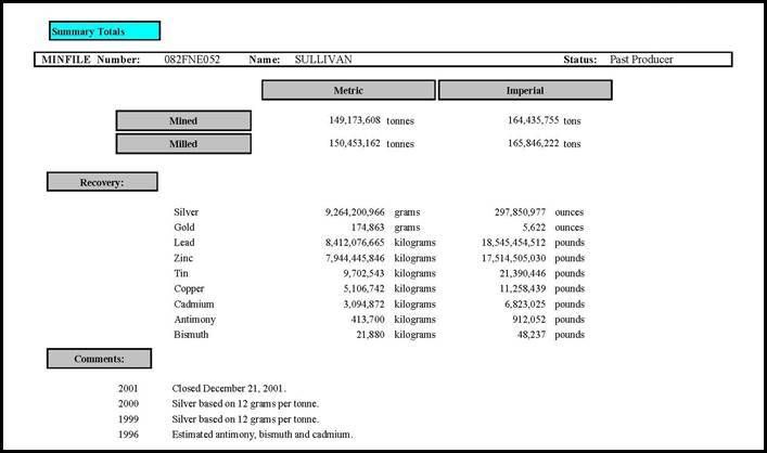 Table 1 - Historical Sullivan Mine - Total Production (source: MINFILE Production Detail Report, BC Geological Survey, Ministry of Energy, Mines and Petroleum Resources, 2025).