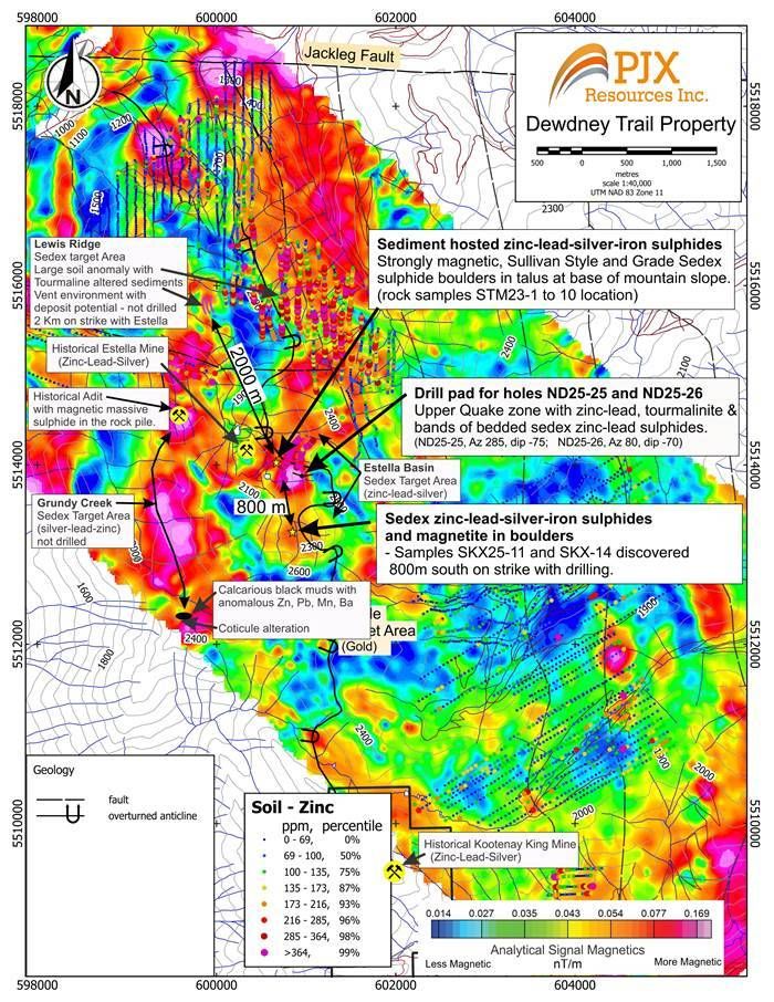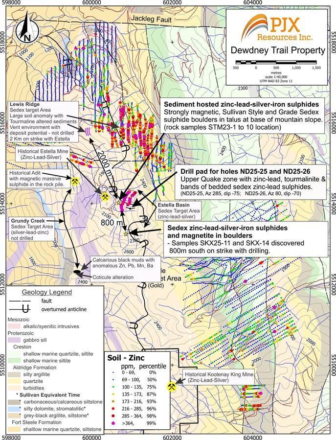 John Keating, President of PJX commented: "We believe the mineralisation and deposit potential of the Dewdney Trail Property is exceptional with the discovery of 3 large target areas. We discovered Sullivan-style and grade boulders in the Estella Basin area only two years ago, and by late 2025, our drilling has already intersected a strongly mineralized system as evidenced by pervasive metal enrichment plumbing through a Quake zone with a true thickness of about 30 metres. Large plumbing systems like this support the potential to discover a significant deposit. We have now identified the 2 additional large targets in the Grundy Creek and Lewis Ridge areas. We plan to continue to drill to discover the deposit potential of the Estella target area while further developing and possibly drilling the Lewis Ridge and Grundy Creek target areas in 2026."