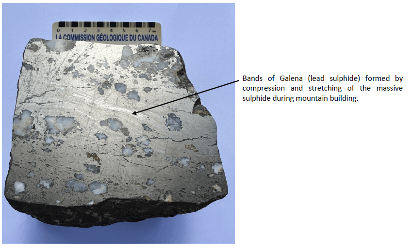 Outcrops of black laminated calcareous muds that are anomalous in zinc, lead, manganese, and barium (Photo 2) occur at the south end of the magnetic anomaly. The combination of this rock type with anomalous mineralisation is indicative of a venting environment and is often associated with Sedex deposits.