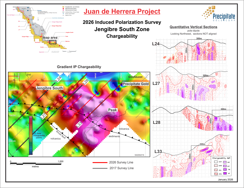 Vancouver, B.C. January 14, 2026 TheNewswire - Precipitate Gold Corp. (the "Company" or "Precipitate") (TSXV: PRG, OTCQB: PREIF) is pleased to announce results from its induced polarization ("IP") ground geophysical survey at the Jengibre South zone within its 100% owned Juan de Herrera Project ("Juan de Herrera" and the "Project") in the Dominican Republic.