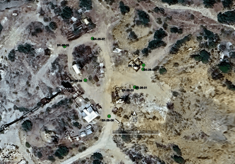 The deep drill test, hole SK-26-07, reached a depth of 1,600 feet (488 m) and intersected quartz veining and stockwork below the historic 700–800 deepest level of the mine. This hole entered a distinctive quartz monzonite intrusive characterized by abundant disseminated pyrite, locally strong potassic alteration (secondary biotite and K-feldspar), and irregular sulfide clots and veinlets containing scattered chalcopyrite and pyrrhotite.