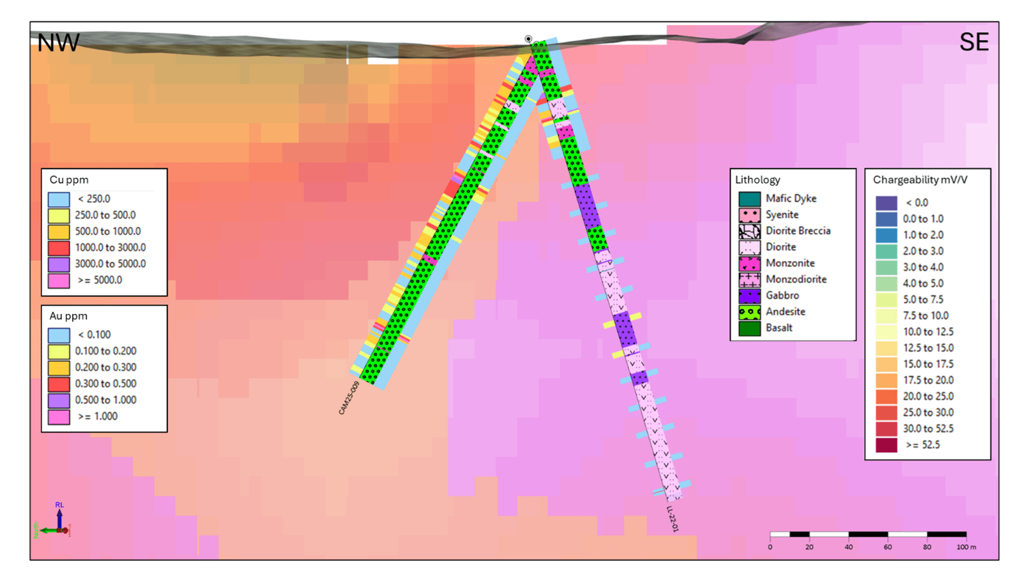 Figure 2: Cross section, looking northeast and 100 m wide, showing holes CAM25-009 and LL22-01 over chargeability. Lithology is displayed on the center-right of the drill trace, with gold assays (g/t) to the right and copper (ppm) on the left.