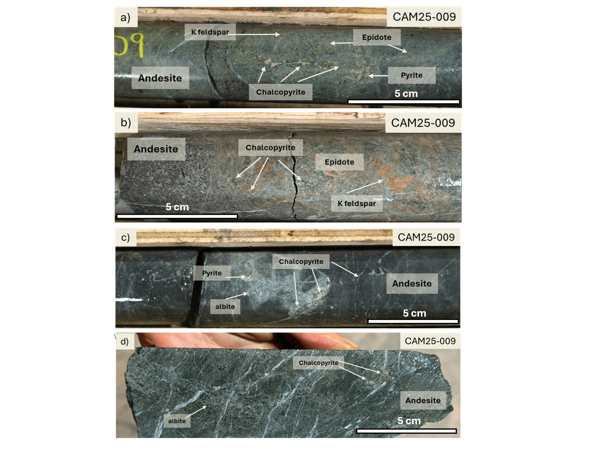 Figure 3: Photos from selected intervals of CAM25-009 showing host rock andesite (a) overprinted by patches of epidote and K-feldspar alteration with blebby chalcopyrite and fine grained pyrite along vein wall selvage at 109.1 m core depth, (b) with disseminated pyrite and chalcopyrite hosted in epidote + K-feldspar alteration at 108.6 m, and (c, d) with patchy albite alteration cut by chalcopyrite- and pyrite-bearing veins at 138.5 m and 189.5 m depth, respectively.