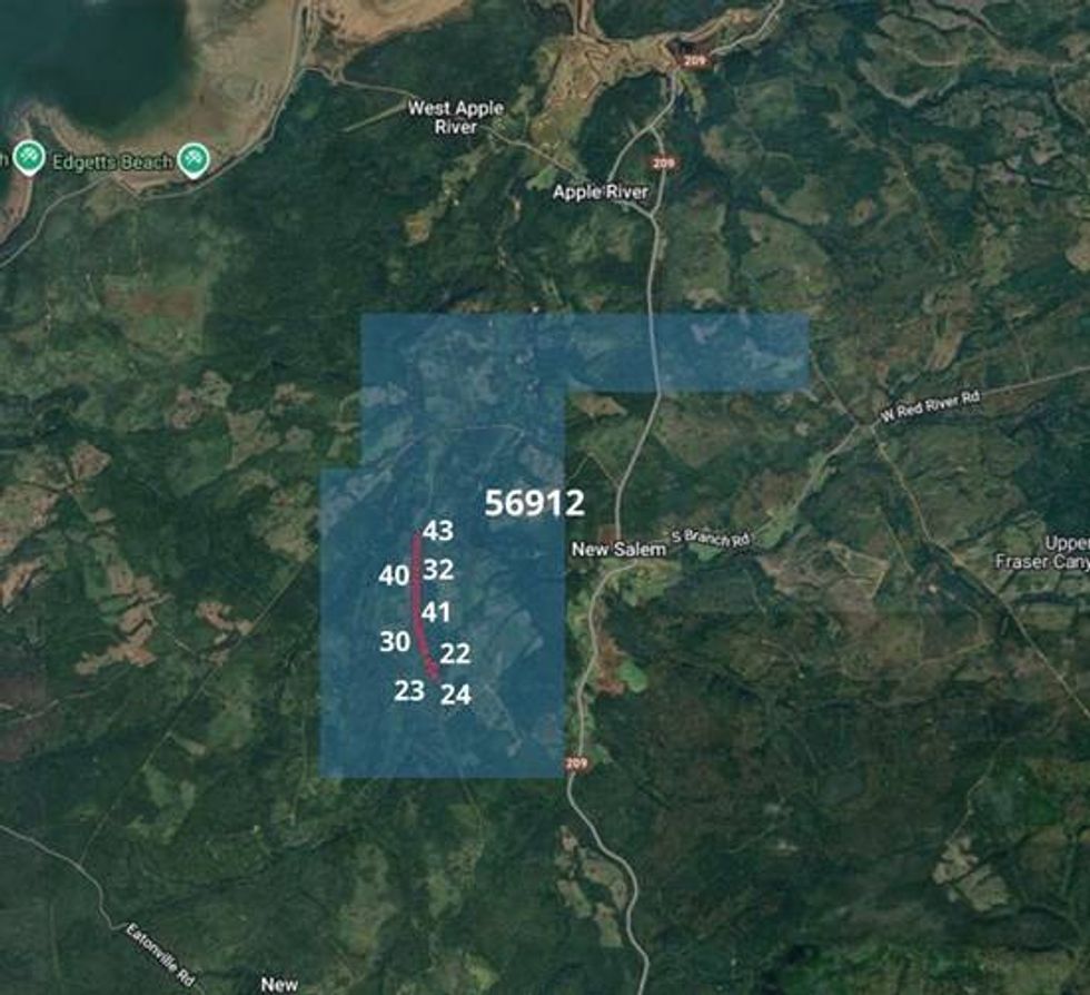 The November 2025 program was conducted within Exploration License EL56912, a license block situated near New Salem and Apple River, Cumberland County, Nova Scotia, as illustrated in Figure 1. The survey comprised a single contiguous traverse of approximately 1.5 kilometres, with 28 sample stations spaced at approximately 50-metre intervals running north-south through the central portion of the license block. Sampling on the northern segment (stations 100-1400) was completed on November 20, 2025, and the southern segment (stations 1500-1750) on November 21, 2025.