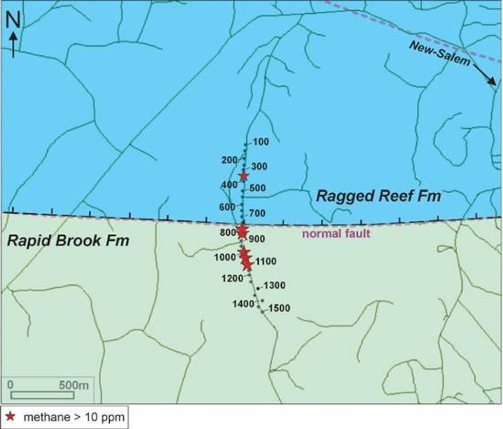 The survey defined a 1.5 km-long section crosscutting the faulted contact between the Rapid Brook (Horton Gp) and Ragged Reef (Cumberland Gp) Formations.