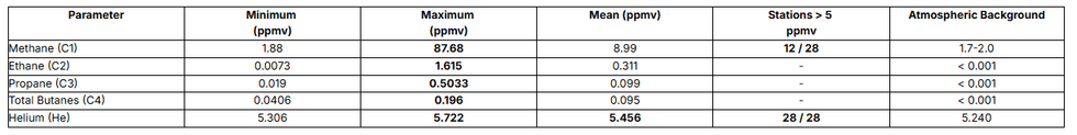 The survey demonstrated the presence of a methane-rich anomaly, extending over 450 m, closely associated with large ethane, propane and butane anomalies that may be consistent with a potential thermogenic contribution to these gases.