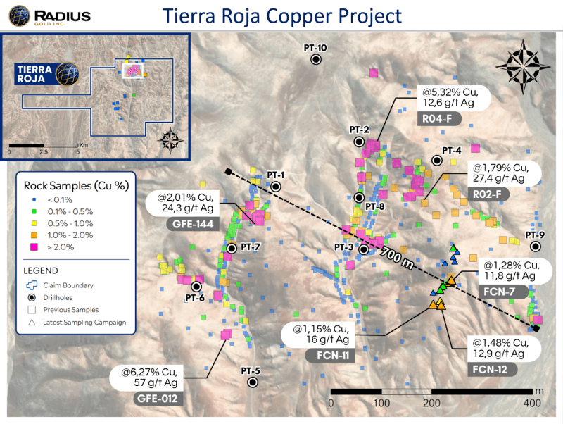 Surface sampling at Tierra Roja includes rock samples, trench samples and samples collected from shallow excavations during multiple reconnaissance campaigns completed by previous operators and by Radius. Radius has reviewed the available historical surface sampling database and has undertaken confirmation sampling that is consistent with the copper and silver geochemical anomalies identified to date on the project. Samples collected by Radius were analyzed by independent laboratories using established analytical and QA/QC procedures. As exploration advances, Radius will continue to apply industry-standard sampling and analytical protocols and follow recognized QA/QC practices in accordance with applicable regulatory requirements.