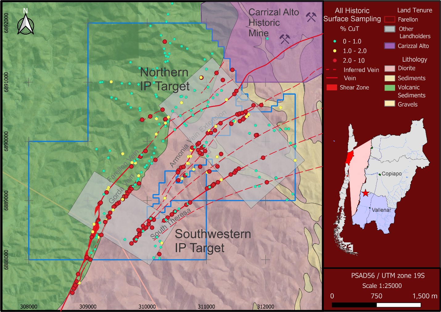 Red Metal Resources President and CEO, Caitlin Jeffs, stated, "The Red Metal team's work to date has confirmed exceptional copper and gold grades over more than 12 km strike extent of veins on the Carrizal Property. By engaging Geophysical Studies Chile for this IP survey, we are taking the next step in preparing for the second phase of drilling and demonstrating the full extent of the copper-gold mineralization system."
