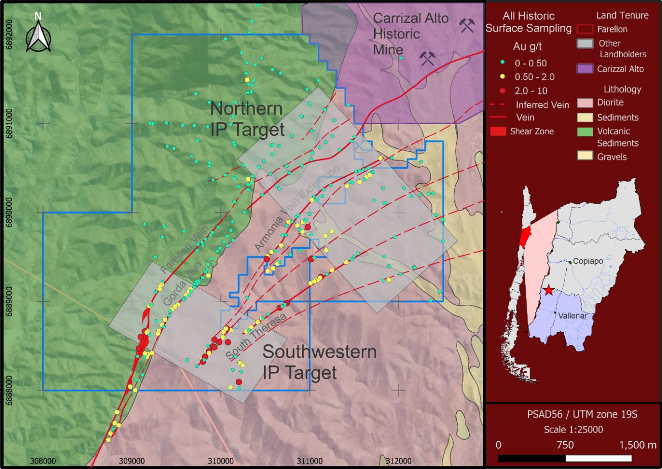 Figure 1 & 2: Carrizal Vein Targets for IP with historic Cu & Au surface samples