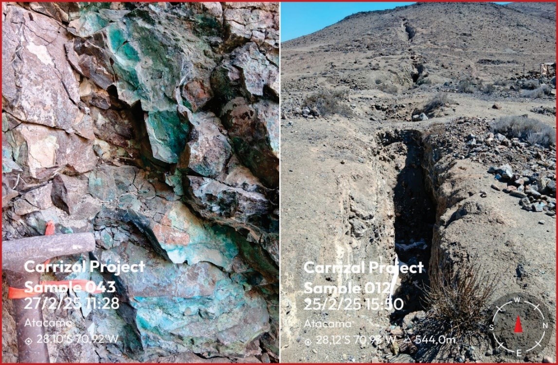 Figure 3: Outcrops from surface sampling program completed in 2025 showing historic excavations and copper oxides. CARZ-25-043 3.83% Cu, 0.5 g/t Au, CARZ-25-012 2.91% Cu, 1.9 g/t Au