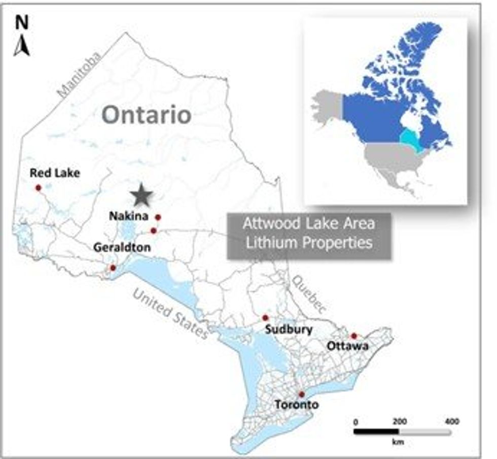 The Attwood Project consists of two claim groups, namely the Witchwood and Greenside Lithium properties comprising 3,026 hectares (7 claims) and 2,546 hectares (6 claims) respectively. The Attwood properties are located approximately 170km northwest of Nakina, Ontario. Access to the Project properties can be made by good all‐weather road as well as current and near‐future logging road access.