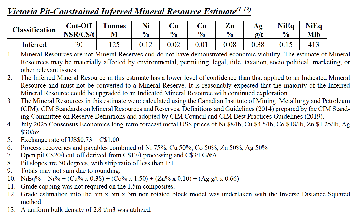 NI 43-101 Technical Report ("Report") includes initial Inferred Mineral Resource Estimate ("MRE") for the Victoria road accessible open pit nickel sulphide polymetallic deposit in Quebec, with hydro-electric powerline crossing site.
