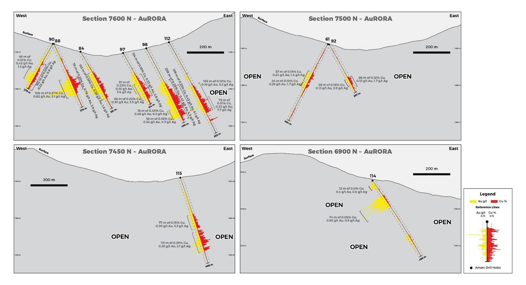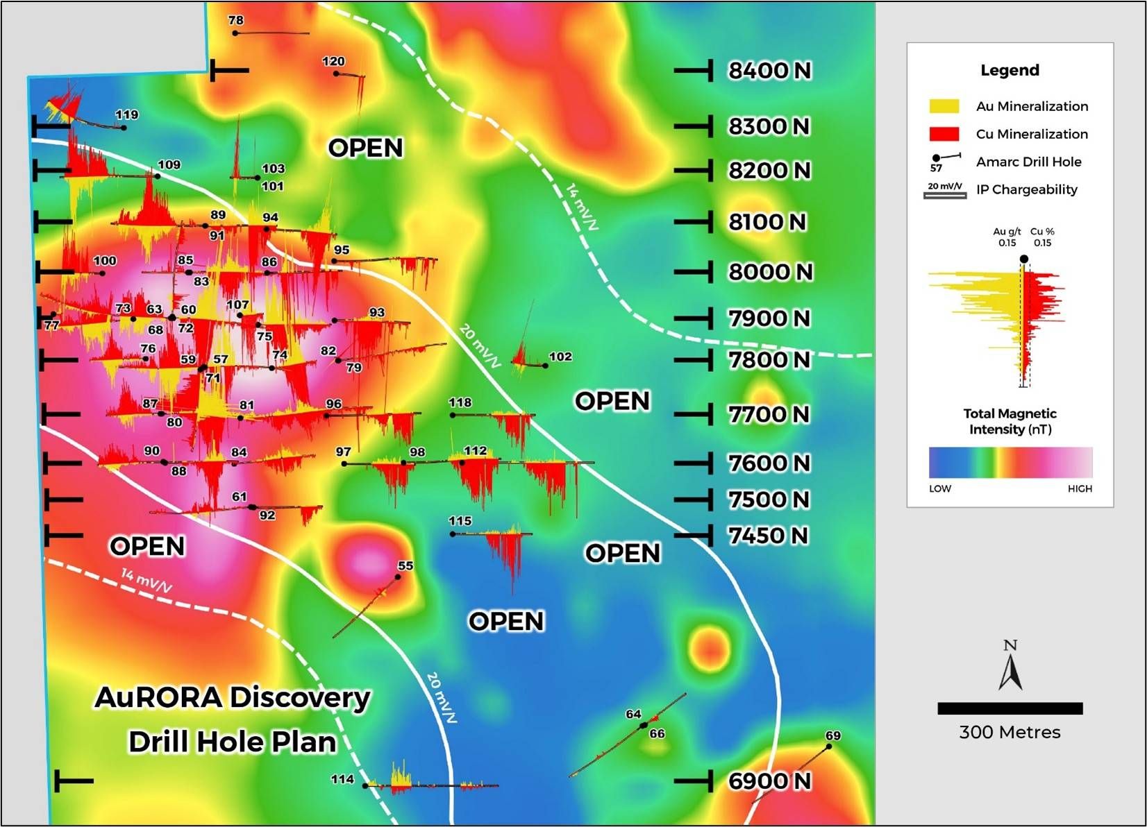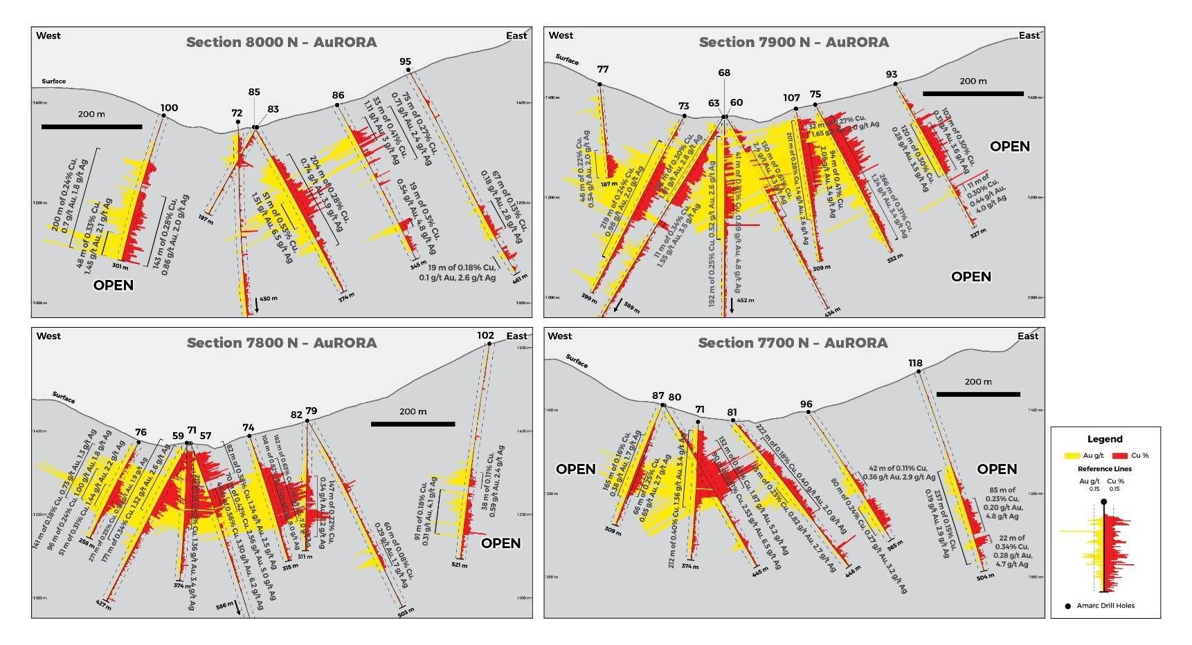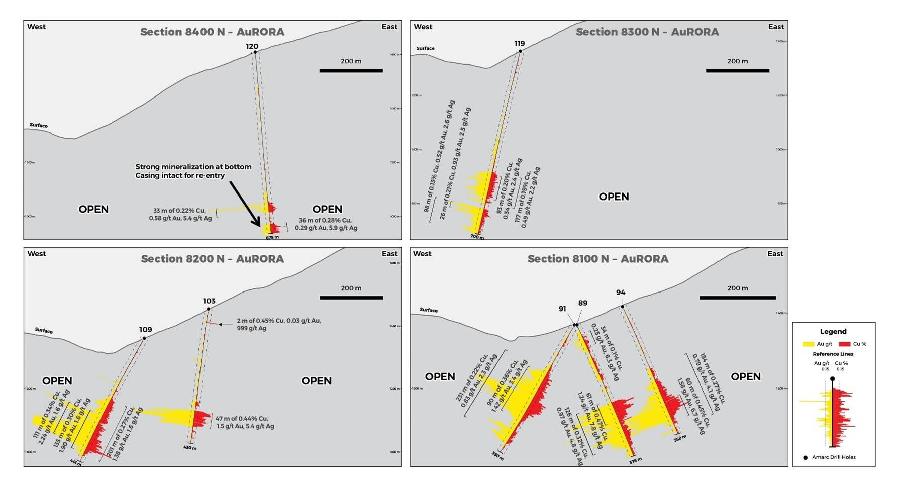 Results previously announced in late 2025 from eight holes completed on Sections 8000N, 8100N and 8200N successfully expanded AuRORA +300 m to the north (Figure 1, and Amarc releases November 3 and December 10, 2025). Today, we are announcing drill hole JP25119 located on Section 8300N, which has expanded AuRORA a further +100 m to the north (Figures 1 and 2, and Tables 1 and 3), for a cumulative +400 m northern extension of the deposit in 2025. This sector of the Deposit requires further drilling.