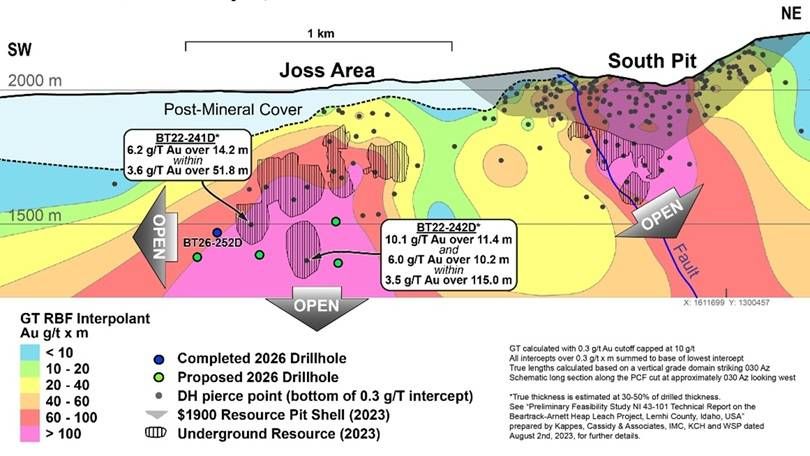 The first phase, open pit heap leach Preliminary Feasibility Study ("PFS") at Beartrack-Arnett and the resulting Net Asset Value estimate excludes underground Mineral Resources. The current drill program at Joss is planned to evaluate the potential for a subsequent underground phase of operation at Beartrack-Arnett.