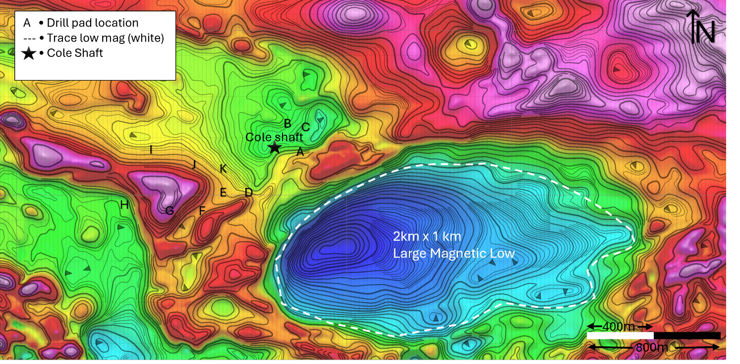 Figure 1 - Reduced to Pole (RTP) Total Magnetic Intensity, Drone Magnetic Survey, Cole Gold Mines Property, Red Lake, Ontario. Letters A-K denote drill pad locations.