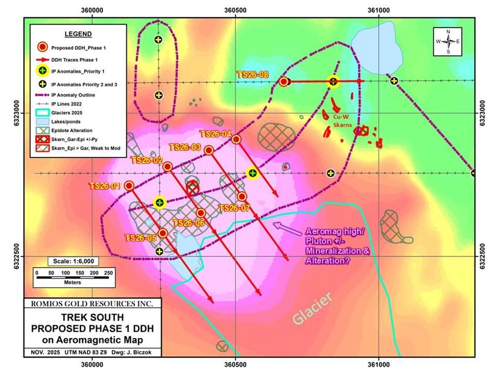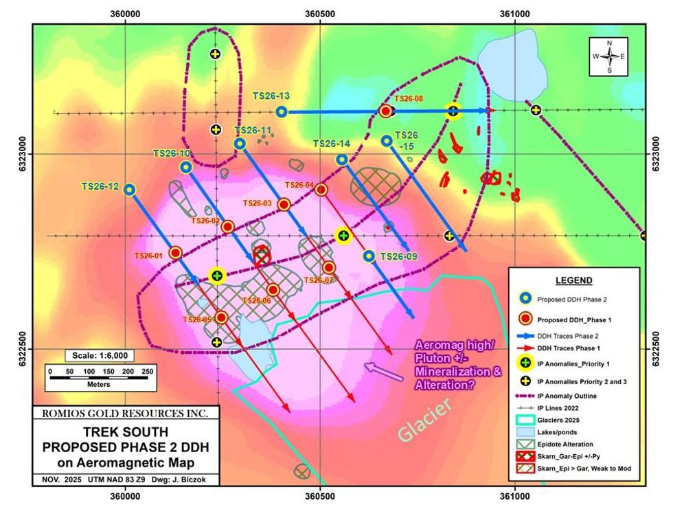 The Technical Report has been prepared in support of Company plans to initiate the first-ever drilling in the 2026 field season of the fully drill-permitted, Trek South porphyry copper-gold prospect. Trek South is located on the accessible south side of the Boundary Range adjacent to Galore Creek Mining Corporation's (GCMC) Isbā construction camp, and just 7.5 kms southeast of the giant Galore Creek porphyry deposits, presently undergoing pre-feasibility studies by GCMC's 50/50 joint venture partners Teck and Newmont. For more information on the Trek South prospect, please see the Company news release and CEO letter to shareholders dated December 15, 2025 and Trek South presentation available at: https://www.romios.com/investors#presentions.