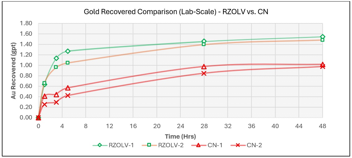 Under the specific laboratory test conditions applied, RZOLVâ„¢ achieved dissolved gold concentrations ranging from 1.48 to 1.55 gpt Au in solution over a 48-hour leach cycle, compared to 0.98 to 1.02 gpt Au achieved using a reference solution containing 1,000 ppm sodium, consistent with typical laboratory benchmarking concentrations". Early-time leach kinetics for RZOLVâ„¢ were also observed to be equal to or faster than cyanide, with materially higher dissolved gold tenors achieved within the first 5 hours of leaching.