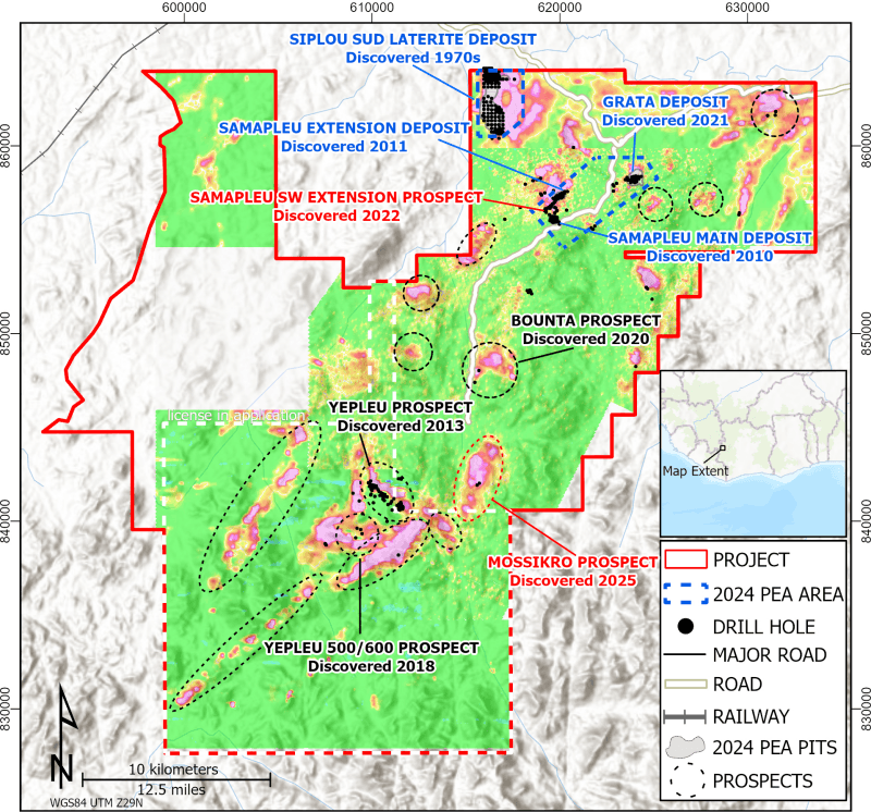 The 2026 exploration program is designed to demonstrate the Project's significant district-scale potential through the discovery of new high-grade polymetallic mineralization, targeting more than 20 high-priority, untested electromagnetic ("EM") targets (2013-2018 Airborne electromagnetic surveys) with comparable features and scale as the Samapleu and Grata Deposits, distributed throughout the 879 km² land package (Figure 1). The 2026 program will build on the success of the limited 500-meter 2025 regional exploration program, which led to the discovery of the Mossikro Prospect, located 10 kilometers to the south-southwest of the 2024 PEA Area.