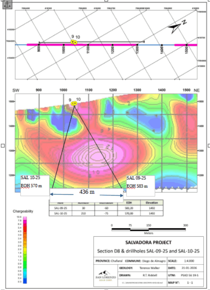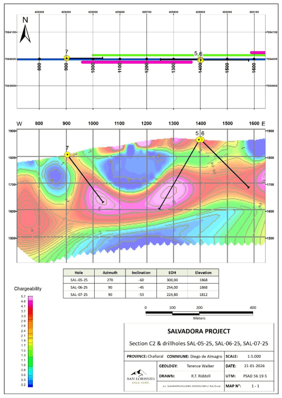 The 3 Cerro Blanco holes drilled on the west side of the litho-cap feature followed the drilling of hole SAL 04 – 25 on the east side of the litho-cap feature (see San Lorenzo press release dated January 26, 2026).
