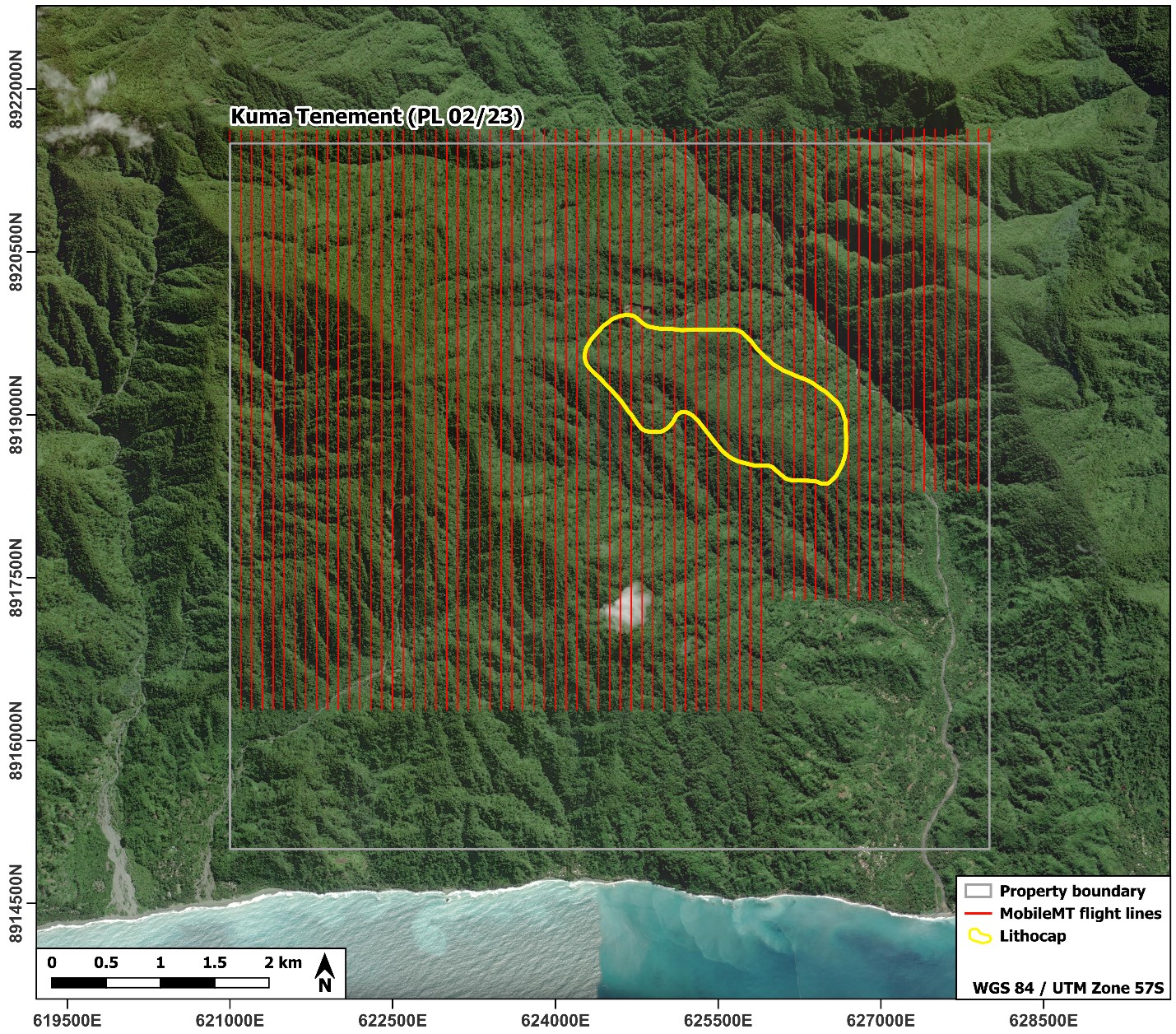 Figure 1: Kuma property and lithocap extent with Mobile MT survey flight lines.