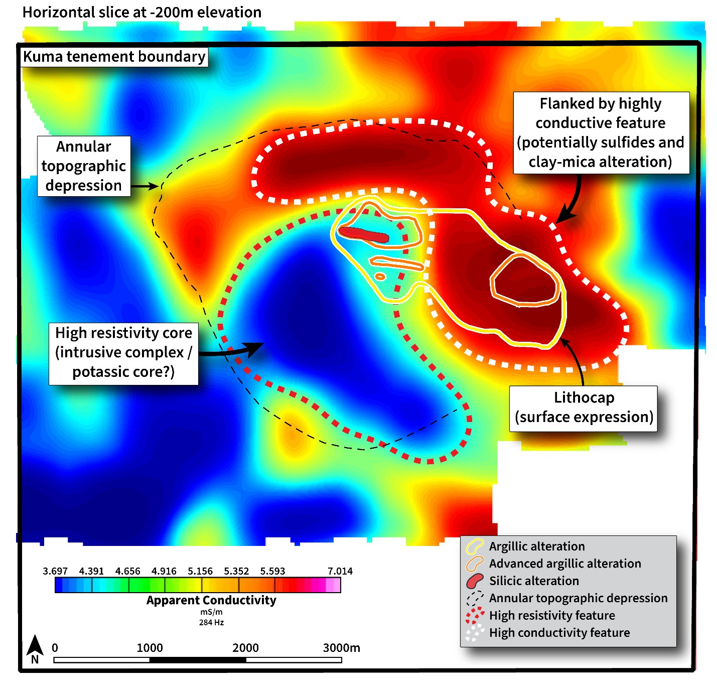 - The results of the Mobile MT survey at Kuma reveals a broad 5 x 2 km ring-shaped zone of high conductivity that flanks a central 2 x 3 km highly resistive feature (see Figure 2), with the conductive feature spatially correlating to the mapped lithocap.