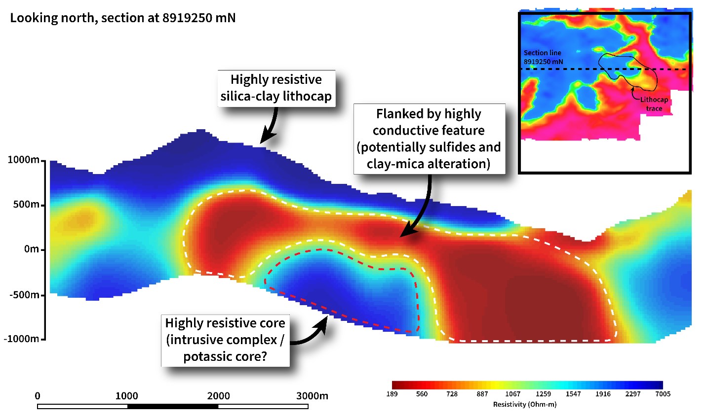 - The resistive and conductive trends display typical porphyry signatures, similar to other economic porphyry systems currently being mined.