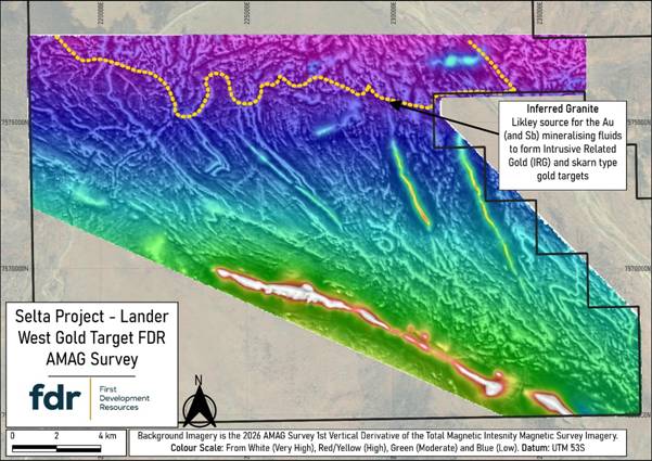 Lander West is interpreted as a continuation of the Stafford Gold Trend, where the adjacent ground hosts high-grade gold and antimony ("Sb") mineralisation in the same geological units extending to the southeast (1). Gold mineralisation is believed to be shear-hosted, associated with zones of deformation and hydrothermal alteration, which produce subtle but measurable variations in magnetic response. Within Lander West, a very large granitic batholith, with smaller granite stocks along its margin, have been identified by the AMAG data to sit below thin sand cover sediments, and these granites are a likely source for the Au (and Sb) mineralising fluids to form Intrusive Related Gold ("IRG") and skarn type gold targets with FDR's land holding. High-resolution geophysical datasets are therefore critical to refining drill targets and advancing FDR's gold exploration programme.