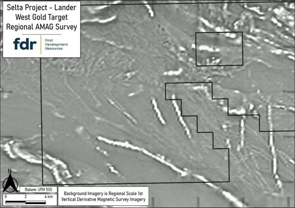 Following detailed desktop studies, FDR has identified the Lander West regional gold target area as a priority focus within the broader Selta Project. This target has been supported by a comprehensive gold targeting study completed by Resource Potentials Pty Ltd ("ResPot"), a Perth, Western Australia-based Mineral Exploration and Geophysical Consultancy. ResPot has been commissioned to integrate historical drilling, geological, geophysical, and geochemical datasets to help FDR define high-potential gold targets for follow-up work.