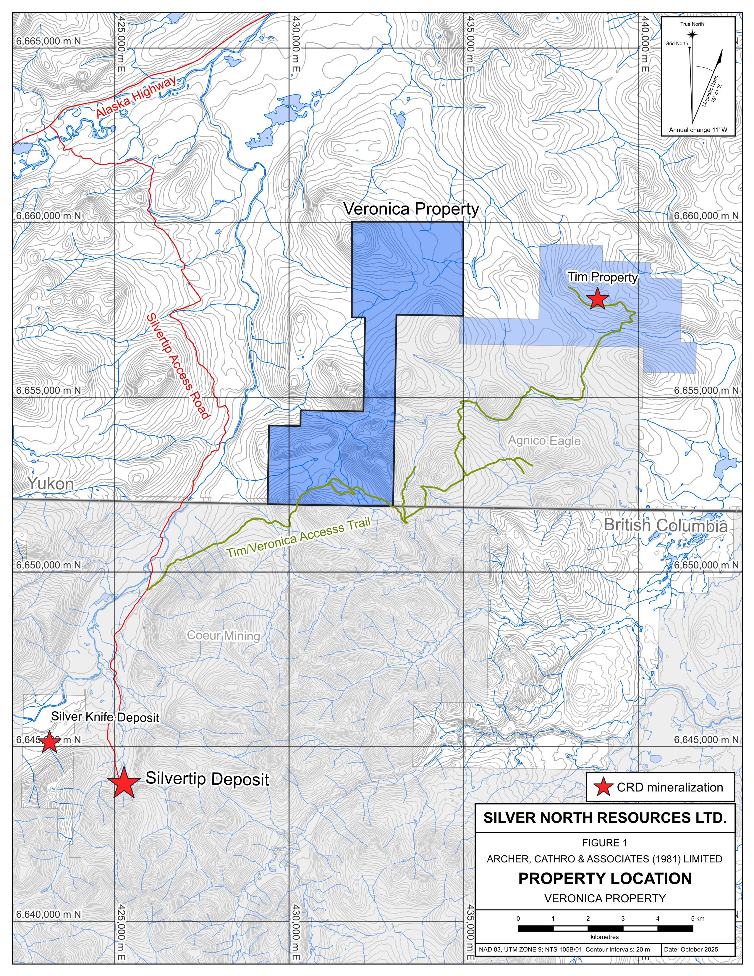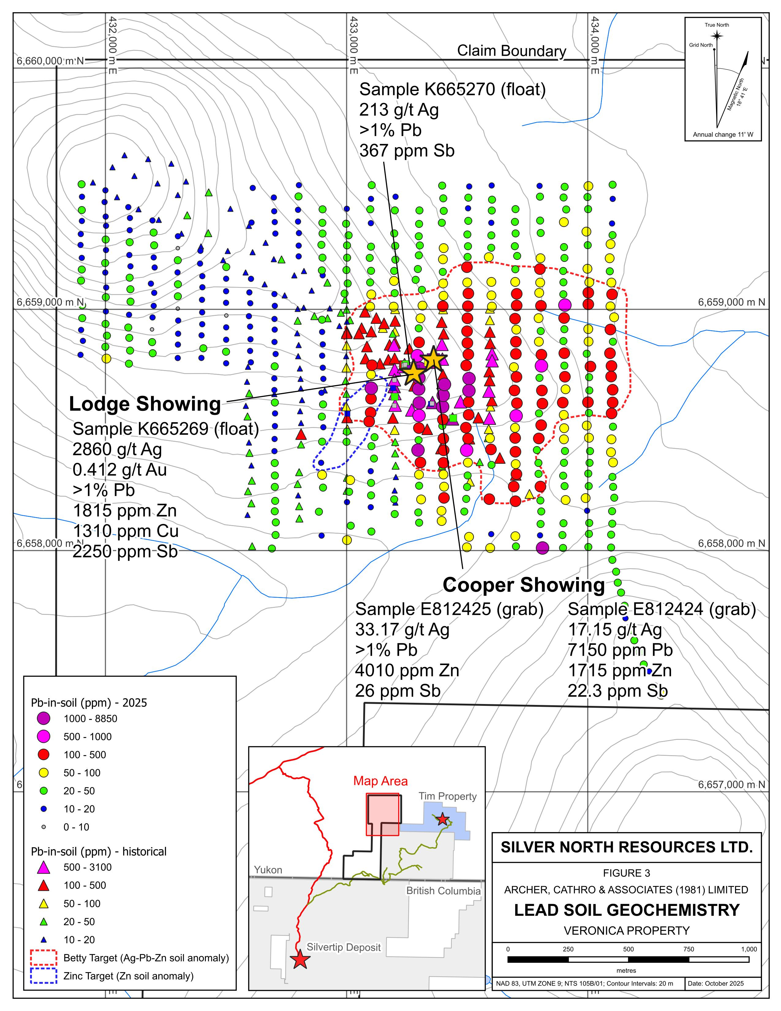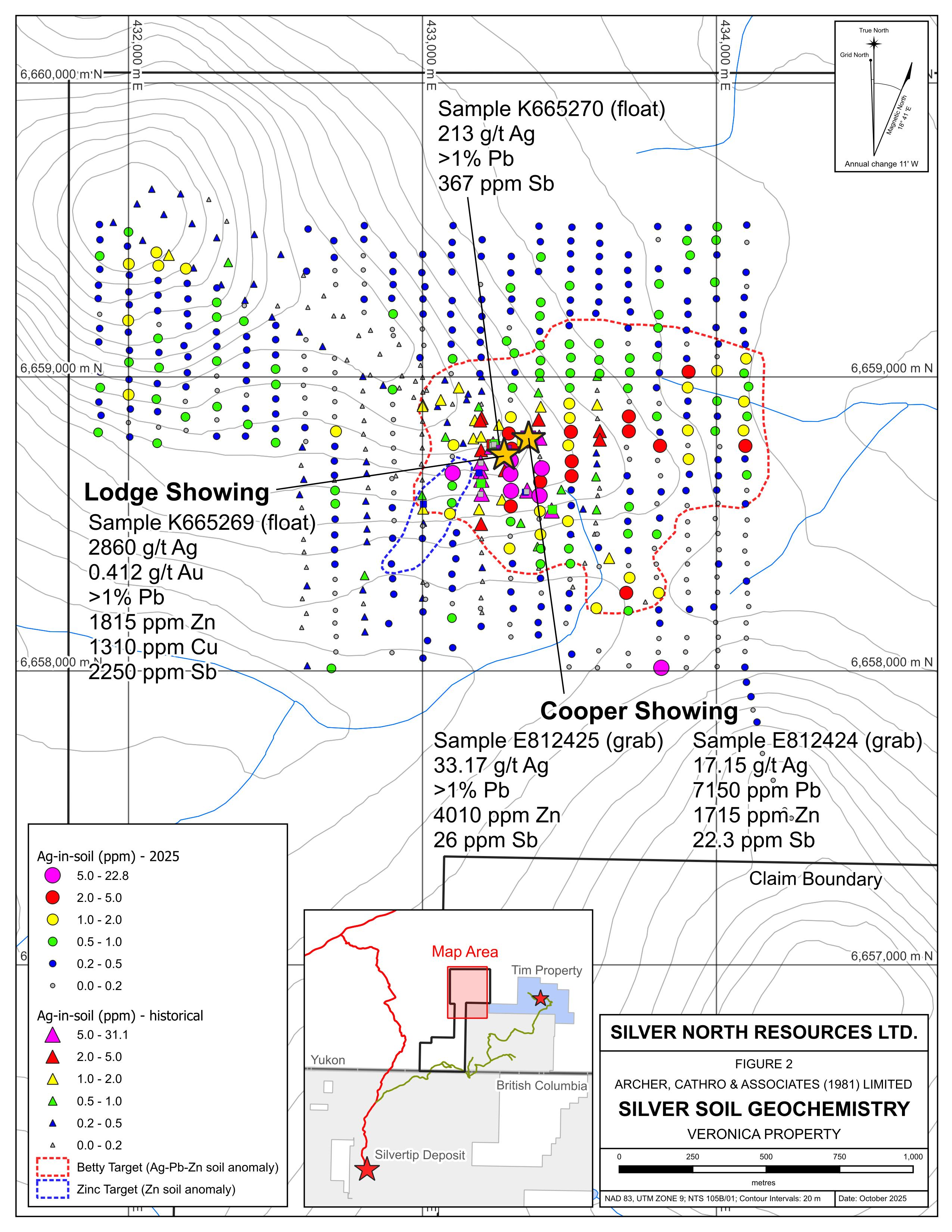 Vancouver, BC – TheNewswire - October 28, 2025 - Silver North Resources Ltd. (TSX-V: SNAG, OTCQB: TARSF) (" Silver North " or the " Company ") is pleased to announce analytical results from the 2025 field exploration program at the Veronica Property, one of three properties comprising the GDR Project in southern Yukon Territory (Figure 1). Results of the program, which included prospecting, geological mapping, soil geochemical sampling and hand trenching include the expansion of the previously identified multi-element soil geochemical anomaly (the Betty target) as well as the discovery of silver-bearing mineralization in float cobbles ( 2,860 and 213 g/t silver ) and in outcrop (33.7 and 17.15 g/t silver). Prior to the 2025 program, no silver-bearing mineralization had been discovered on the Veronica property.